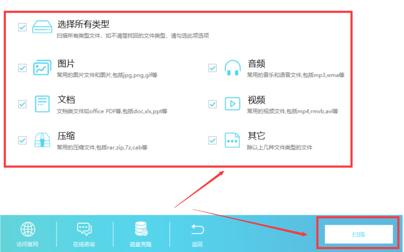 然后,根据丢失的数据,选择对应的数据位置。如果您丢失的数据是在电脑的硬盘里,那么直接勾选对应的硬盘名称。如果您丢失的数据是在电脑的桌面上,那么直接勾选“C盘”,并点击“下一步”。紧接着,根据丢失的数据,选择对应的数据位置。如果您丢失的数据是PDF、Excel、PPT等,那么直接勾选“文档”。如果您丢失的数据太多了,还可以选择“选择所有类型”,并点击“扫描”。