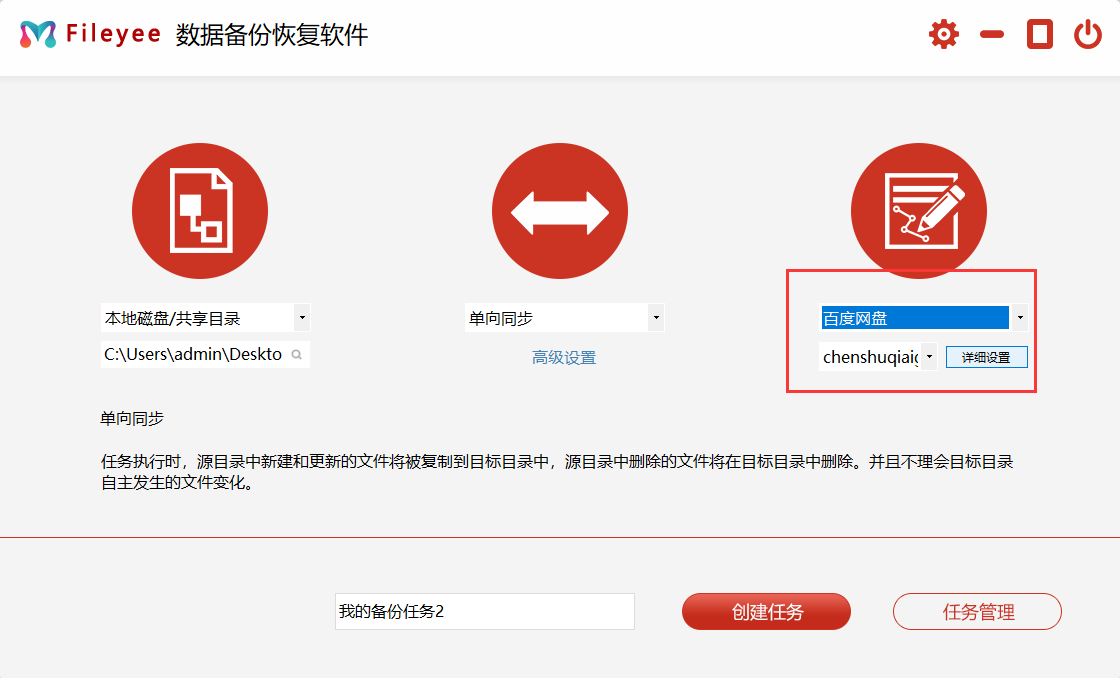 第1步,打开FlieYee数据备份恢复,软件左边进行备份源设置,我们选择“本地磁盘”,添加电脑中需要备份的文件夹;中间选择文件备份同步方式,根据自己的具体需求选择同步方式。