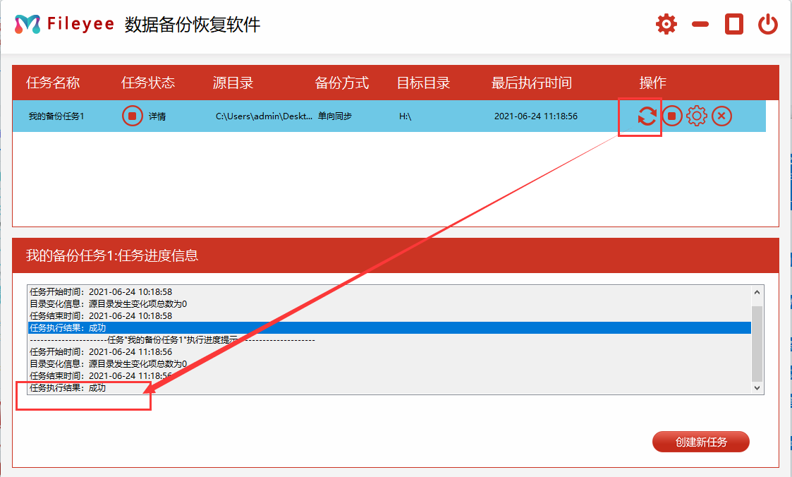 第4步,点击备份任务右边对应的【开始】图标,执行第一次文件备份,任务执行结果显示成功的时候,说明文件备份成功了。