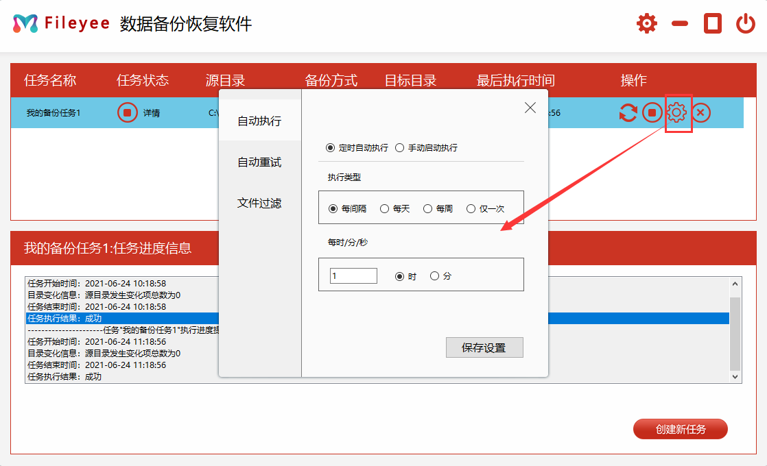 第5步,软件默认一个小时进行自动备份一次,如果你想调整自动备份的时间,那么点击【设置】图标,进行自动备份的参数设置,然后点击保存。这样电脑文件就可以定时自动备份了。