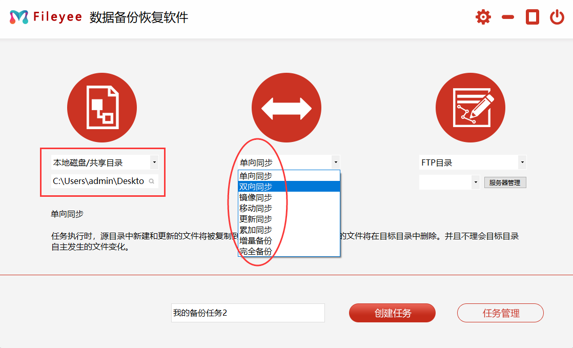 步骤1,打开FlieYee数据备份恢复,如下图所示左边设置备份源,选择“本地磁盘/共享目录”,然后选择添加电脑中需要备份的文件夹;中间设置备份同步方式,有多种方式,根据你的需要选择合适的即可。