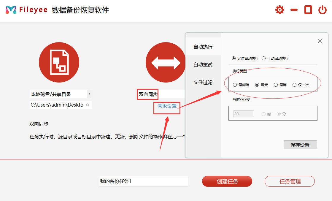 步骤2,中间位置设置数据的同步方式,点击下拉选择“双向同步”,然后点击下方的“高级选项”设置文件的自动同步参数,可以精确到分钟/每天/每周等,根据自己的情况而定。