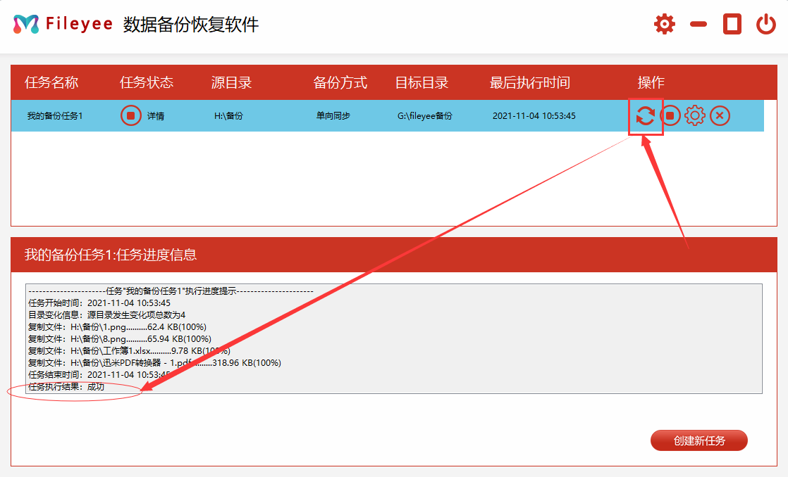 步骤3,找到刚刚创建的备份任务,点击右边的“开始”图标按钮,启动备份任务,执行结果成功寿命备份完成。