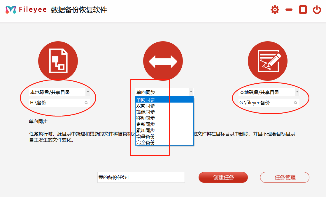 步骤1,下载“FileYee数据备份恢复”软件后安装打开,然后进行设置,左边设置备份源,选择你U盘中需要备份的文件夹;中间选择适合的数据同步方式;右边设置备份目标,选择文件需要备份到哪个文件夹里。