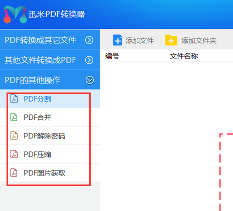 除了文件的相互转换的功能外,迅米PDF转换器还有几个亮点功能,包括:PDF文件的分割、合并、压缩、图片获取、解除密码,这几个功能的出现,更能满足我们在PDF文件使用中的需求。