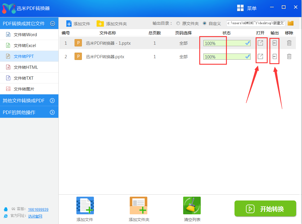 第五步:如下图所示,当转换进度条变成100%的时候,说明PDF已经成功的转换成了PPT文件。我们可以选择右侧的【打开】或者【输出】图标按钮查看到文件的效果或者保存的位置。