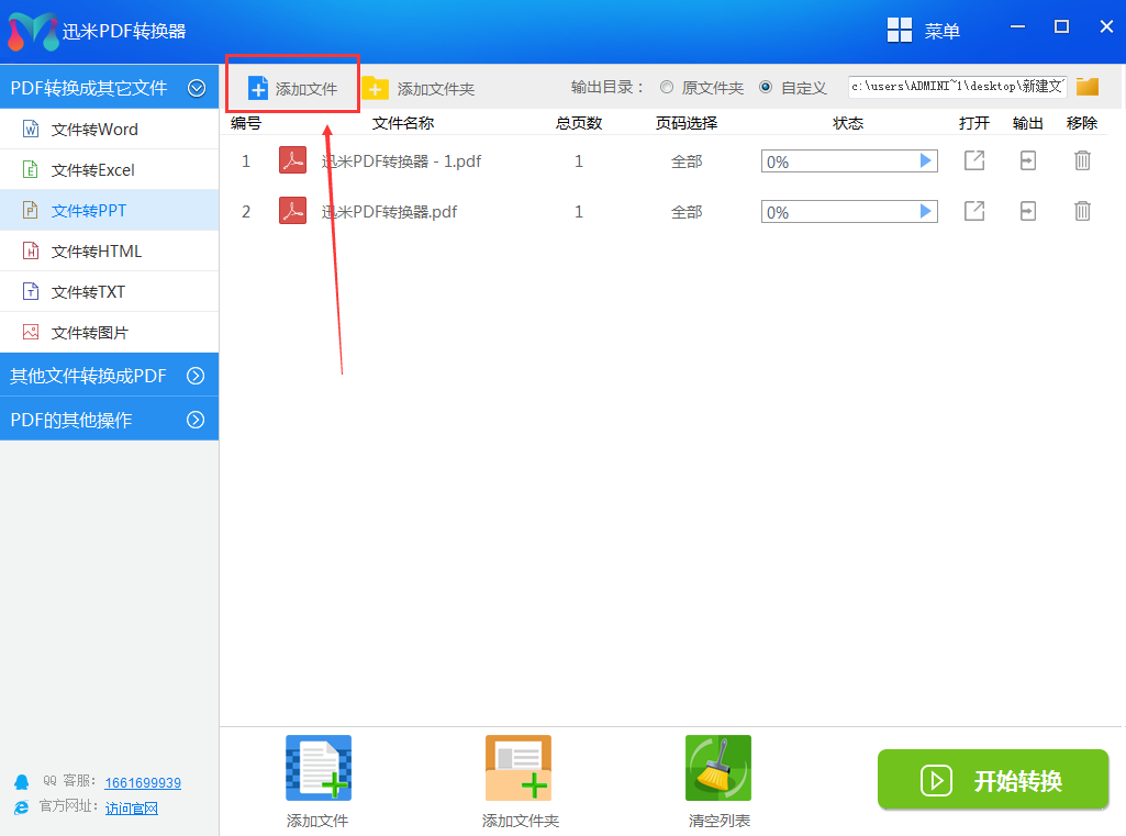 第二步:如下图所示,点击迅米PDF转换器工具中的【添加文件】,然后将需要转换的PDF文件添加到软件中。如果有多份PDF文件,可以按住[Ctrl]键,进行批量添加PDF文件,本软件支持多个文件同时转换。
