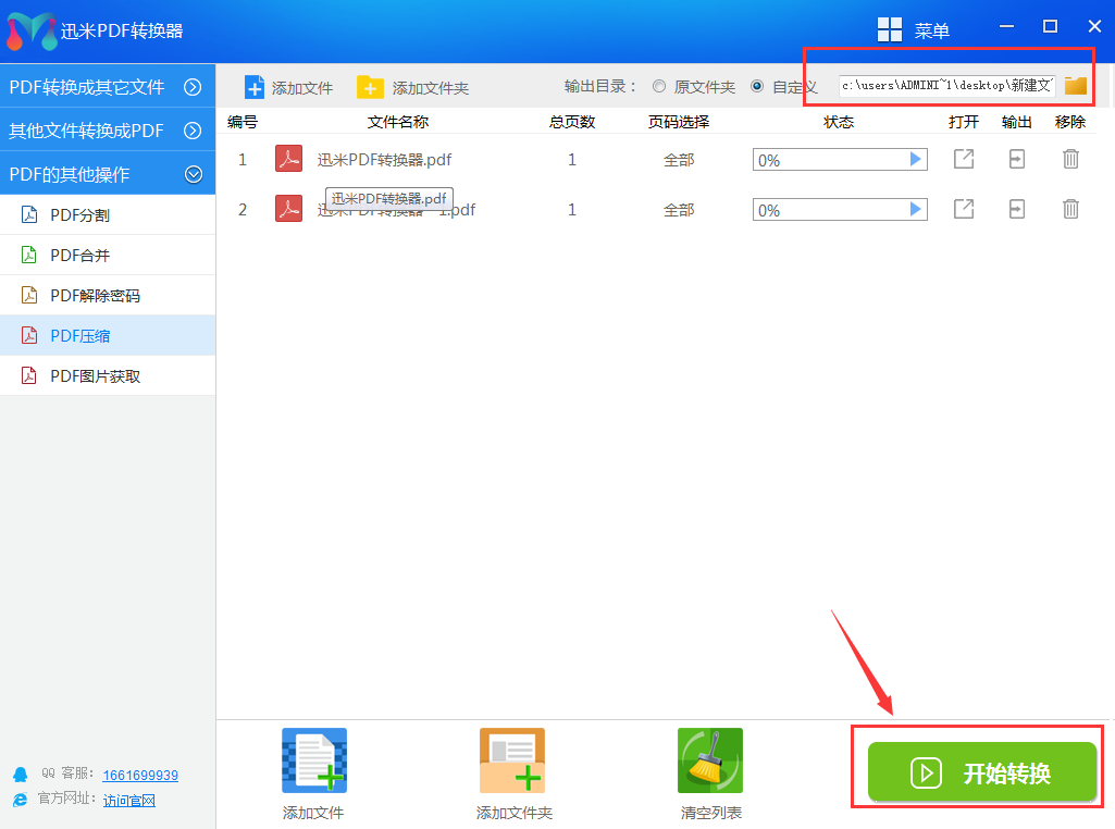3、在软件右上方设置文件保存位置,然后点击右下角的“开始转换”按钮,开启压缩操作。