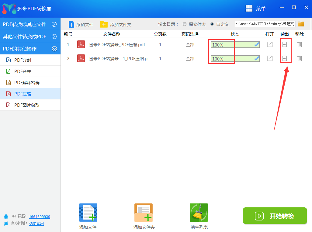 4、当转换进度条变成100%时说明压缩完成,点击右侧输出按钮就可以看到压缩后的文件了。