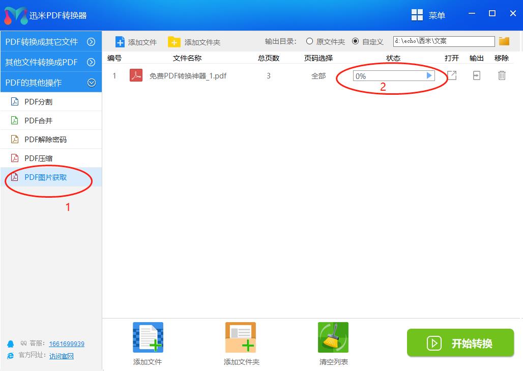 打开迅米PDF编辑器,选择PDF其他操作-PDF图片获取,点击添加文件,可以添加一个或多个PDF文件,如下图所示: