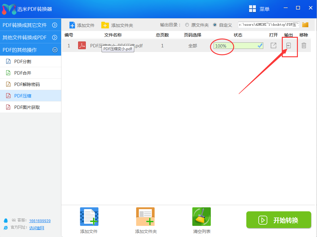 步骤4、当状态栏中的压缩进度条到达100%时说明文件压缩完成,这时候只需要点击右侧的“输出”图标按钮,就可以打开文件夹了。