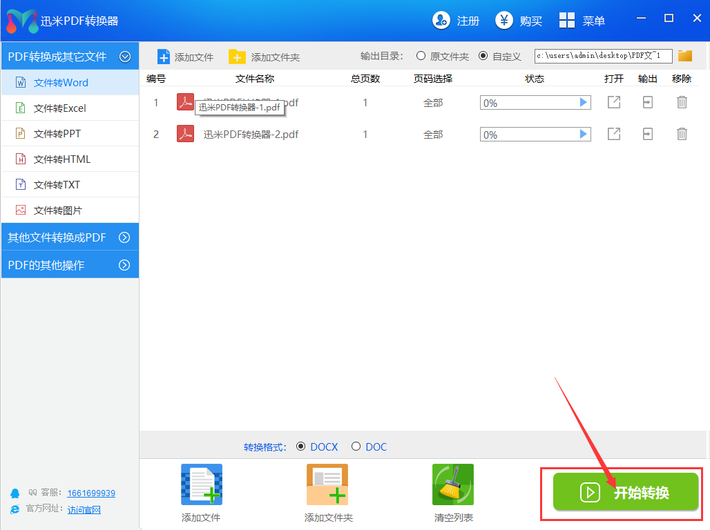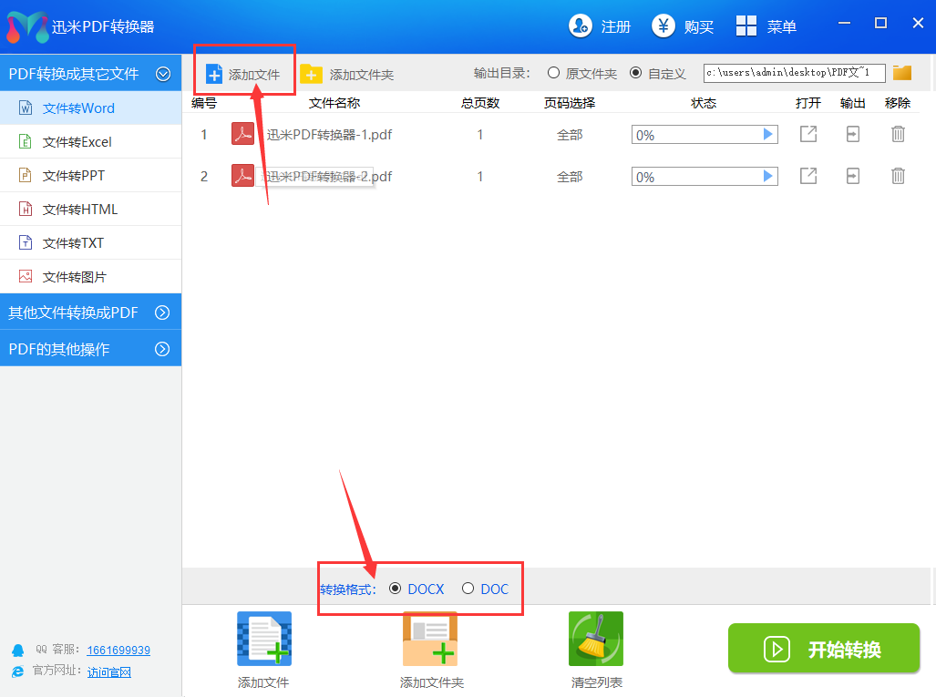 第2步:点击软件中的“添加文件”按钮,将需要转换的PDF文件添加到软件中,然后设置转换格式:doc格式或者docx,二选一。