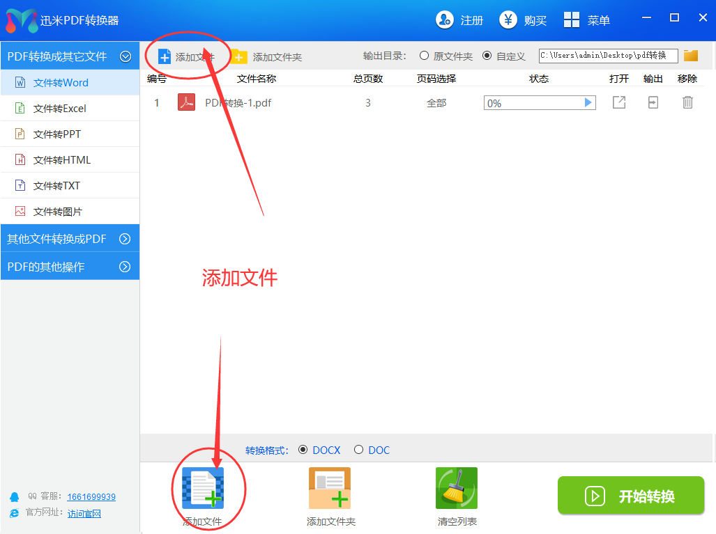 步骤1、打开迅米PDF转换器,软件的左边是功能列表区,我们可以看到“文件转Word、文件转Excel、文件转PPT、文件转Html、文件转TXT、文件转图片”等功能,根据你的需要点击选择对应的功能,进入下一步。(我在这就选择“文件转word”功能来为大家做演示)