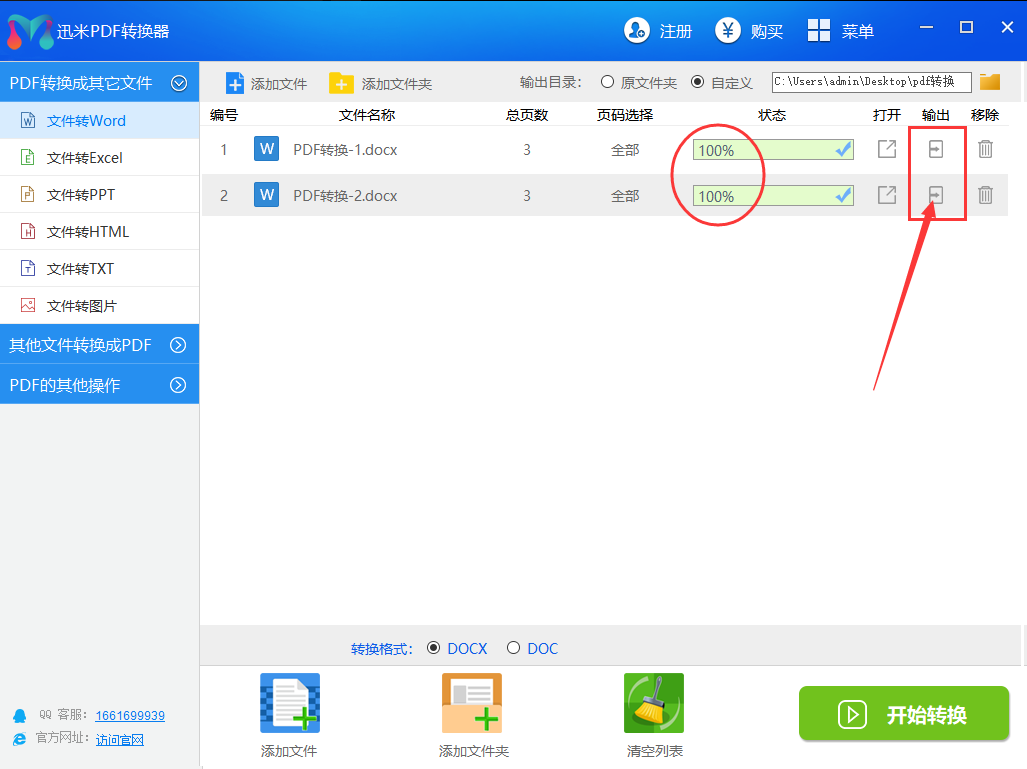 步骤4、当所有文件名称右边状态栏下面的的转换进度条变成绿色的100%时,说明这些PDF文件都成功的转换成了其他格式的文件。我们点击右边对应的“输出”图标,就能打开查看这个文件了。