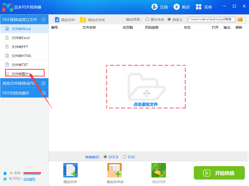 步骤1,打开安装好的优速图片格式转换器,软件界面左边可以看到所有的功能,我们点击【PDF转成其他文件-文件转图片】功能。
