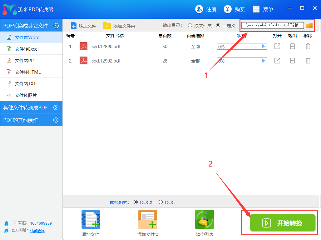步骤1,先下载“迅米PDF转换器”软件包,安装好后打开使用。左边有功能列表,根据自己的需求选择【文件转word】或【文件转ppt】功能。然后点击【添加文件】或【添加文件夹】按钮,将PDF文件导入到软件中,软件支持批量转换,所以可以一次性添加多个PDF文件,节省时间。