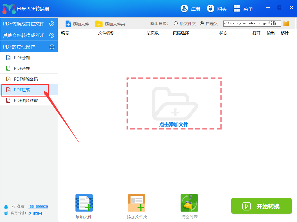 步骤1,打开电脑中已经安装好的SmallPDFer转换器,软件左边列表区域为功能列表,我们找到并点击左边的【PDF的其他操作】-【PDF压缩】功能,然后进入下一步操作。