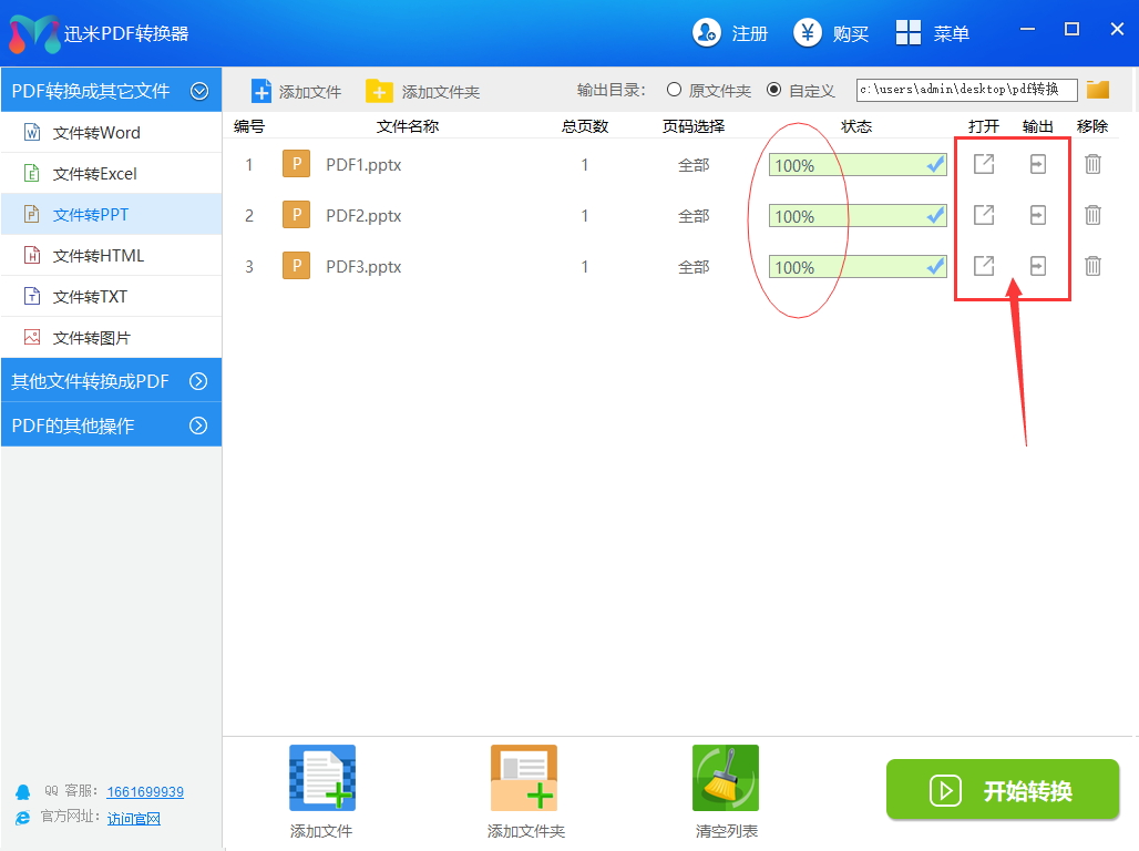 步骤2,先设置输出目录,用来保存转换后的ppt文件。再点击右下角【开始转换】按钮,启动软件。