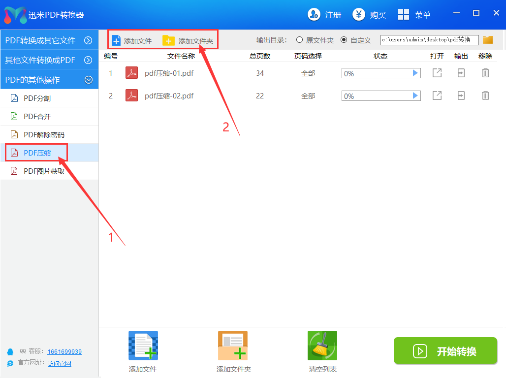 首先,打开电脑上已经安装好的迅米PDFzhuanhuanqi ,软件左边列表区域为功能列表,我们找到并点击左边的【PDF的其他操作】-【PDF压缩】功能,然后进入下一步操作。然后,点击“添加文件”按钮,将需要变小的PDF文件添加到软件中。软件支持多个文件批量压缩变小,所以我们可以同时批量添加多个PDF文件到软件中,这样更节省时间。