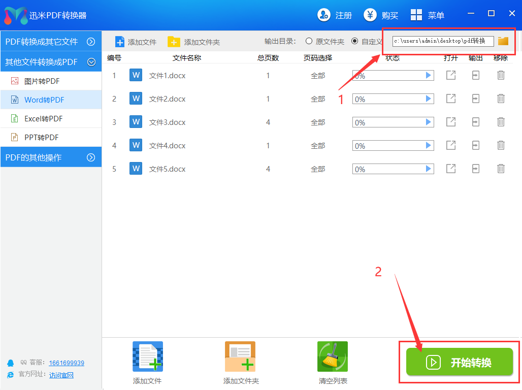 步骤2,先设置输出目录,用来保存转换后的pdf文件;然后点击“开始转换”按钮启动软件。