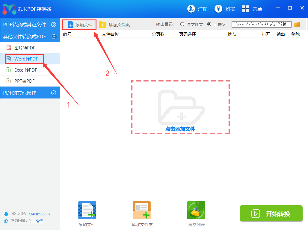步骤1,打开电脑后再打开已经安装好的迅米PDF转换器软件,选择首页的【word转pdf】功能,然后点击“添加文件”按钮将需要转换的word文件导入到软件中。
